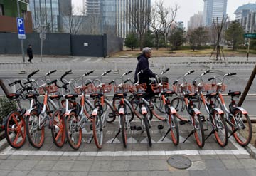 3月17日,在北京市石景山區(qū)銀河大街,共享單車整齊有序地停放在共享單車推薦停車點(diǎn)?!⌒氯A社記者 張晨霖 攝? |