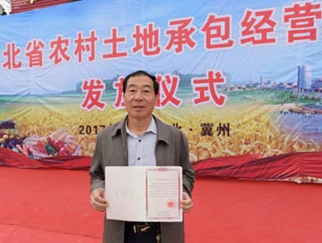 圖為衡水市冀州區(qū)莊子頭村村民魏九明在展示領(lǐng)到的《農(nóng)村土地承包經(jīng)營(yíng)權(quán)證》。新華社記者 王曉/攝?