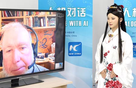 圖為當(dāng)日機(jī)器人佳佳通過(guò)網(wǎng)絡(luò)與科技觀察家凱文·凱利對(duì)話。新華社記者 郭晨/攝