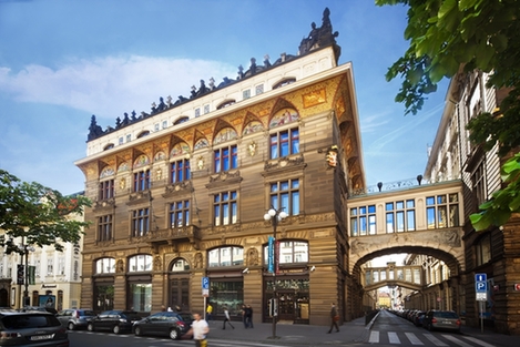 布拉格,護(hù)城河大街22號(hào),一幢建于1896年的建筑看上去古老又滄桑,由于年代久遠(yuǎn),這幢新文藝復(fù)興主義風(fēng)格的大樓,外立面已微微發(fā)黑。引人注目的是,在兩面墻的交接處,一只戴著金色王冠的白色獅子傲然挺立,兩條尾巴交叉揚(yáng)起。