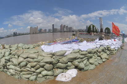 7月3日零時(shí)12分,湘江長(zhǎng)沙站水位上升到39.51米,創(chuàng)下有記錄以來(lái)歷史新高。這是長(zhǎng)沙城區(qū)湘江沿岸用沙袋修筑的子堤(7月3日攝)。記者 龍弘濤 攝? |