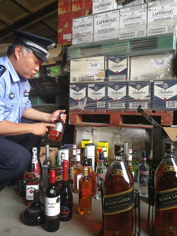 | ?辦案人員在清點(diǎn)走私洋酒。記者 陸敏 攝 |