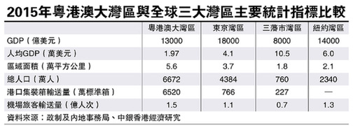 二是經(jīng)濟活動規(guī)??膳c世界一流灣區(qū)并駕齊驅。2015年粵港澳大灣區(qū)GDP達到1.3萬億美元,是東京灣區(qū)的四分之三,接近紐約灣區(qū)的水準,為三藩市灣區(qū)的1.6倍,在全球一流灣區(qū)中處于中游位置。2016年大灣區(qū)進出口貿(mào)易高達1.89億美元,在全球灣區(qū)中處于獨一無二地位,比最早依靠出口加工起家的東京灣區(qū)有過之而無不及。作為重要的交通樞紐,粵港澳大灣區(qū)擁有世界級的??崭廴海?015年港口集裝箱輸送量超過6500萬標準箱,分別是東京灣區(qū)和三藩市灣區(qū)的8.5倍和37.5倍;機場旅客輸送量高達1.5億人次,也超過世界三大灣區(qū)。