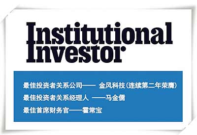 國際資本市場權(quán)威金融雜志《機構(gòu)投資者》(Institutional Investor)年度評獎結(jié)果日益揭曉,金風(fēng)科技從2,500余家亞洲上市公司中脫穎而出,包攬“最佳投資者關(guān)系公司”、“最佳投資者關(guān)系經(jīng)理人”和“最佳首席財務(wù)官”三項大獎。