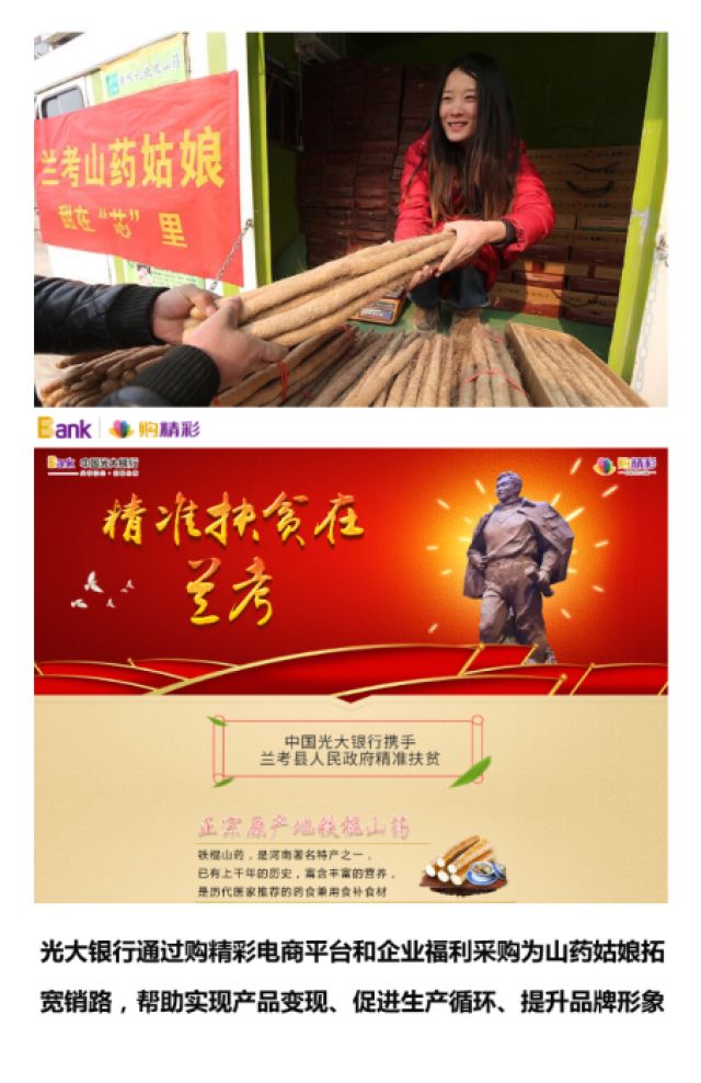 去年11月,中國光大銀行在河南省蘭考縣實地調(diào)研時,了解到潘春婷的創(chuàng)業(yè)歷程、經(jīng)營情況以及創(chuàng)業(yè)困難后,決定幫助她打開外部市場,拓展線上銷售渠道,將“山藥姑娘”的“潘根記”無公害鐵棍山藥引入光大購精彩商城特設(shè)的“精準(zhǔn)扶貧在蘭考”欄目,通過微信、商城等廣泛宣傳向客戶和員工推介。短短一個月時間,光大銀行為“山藥姑娘”帶來40余萬元銷售額,潘春婷得以償還前期貸款,并購入了用于儲存山藥的冷庫,實現(xiàn)了產(chǎn)品變現(xiàn)、促進了生產(chǎn)循環(huán)、提升了品牌形象。