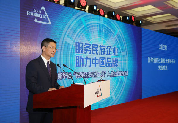 ↑2017年8月26日,在“民族品牌傳播工程”入選企業(yè)簽約儀式上,新華社副社長(zhǎng)兼秘書(shū)長(zhǎng)劉正榮發(fā)表講話。新華社記者 肖磊濤 攝