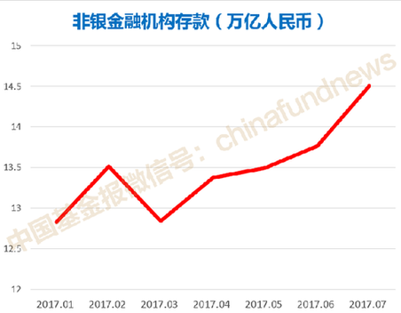 2017年1月,非銀金融機(jī)構(gòu)存款規(guī)模為12.83萬億元,6月增長到13.76萬億元。最新公布的7月數(shù)據(jù)顯示,非銀金融機(jī)構(gòu)存款規(guī)模達(dá)14.5萬億元,環(huán)比1月大幅增加1.67萬億元,增幅達(dá)13%。