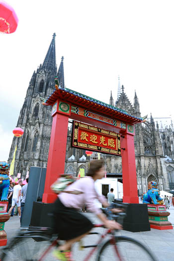 ??? 8月26日,人們?cè)诘聡?guó)科隆大教堂前舉辦的中國(guó)節(jié)上游覽。第三屆科隆中國(guó)節(jié)于8月25日至27日在科隆大教堂廣場(chǎng)舉行。北京老字號(hào)特色商品展賣(mài)、老字號(hào)傳統(tǒng)技藝現(xiàn)場(chǎng)展演、“魅力北京”旅游圖片展等活動(dòng)讓德國(guó)民眾與中國(guó)文化進(jìn)行了一次親密接觸。記者 羅歡歡 攝