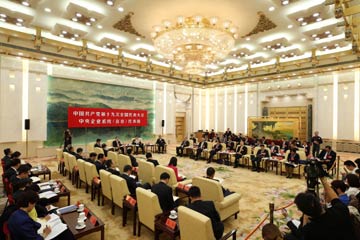 10月18日,十九大部分代表團(tuán)討論向中外記者開(kāi)放。這是中央企業(yè)系統(tǒng)(在京)代表團(tuán)在討論。新華社記者 金立旺/攝? |