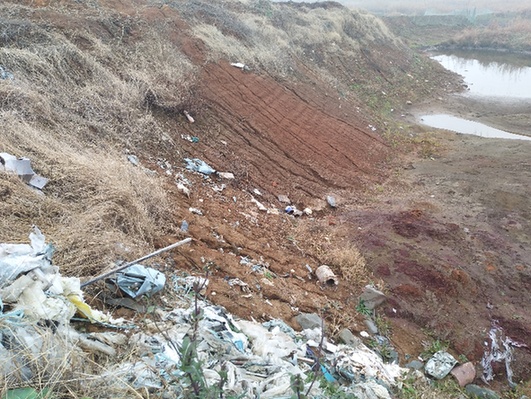 這是在安徽省銅陵市義安區(qū)一處長江堤壩內的傾倒點,凹處呈紅褐色,旁邊隨處可見白色垃圾,刺鼻的氣味隨風飄來。記者采訪了解到,去年5月,有人非法將62.88噸危險廢物——酸洗污泥從浙江嘉善運到安徽,傾倒在這里。記者 姜剛 攝
