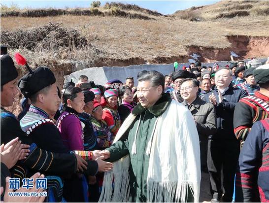 三河村平均海拔2500多米,是一個(gè)彝族貧困村。習(xí)近平沿著石板小路步行進(jìn)村,察看村容村貌和周邊自然環(huán)境。他先后走進(jìn)村民吉好也求、節(jié)列俄阿木2戶貧困家庭看望,詳細(xì)觀看門前的扶貧聯(lián)系卡,同主人親切拉家常,詢問(wèn)生活過(guò)得怎么樣,發(fā)展什么產(chǎn)業(yè),收入有多少,孩子有沒(méi)有學(xué)上。他饒有興趣地聽(tīng)10歲小女孩吉好有果唱《國(guó)旗國(guó)旗真美麗》,并帶頭鼓掌。在村民節(jié)列俄阿木家,習(xí)近平同村民代表、駐村扶貧工作隊(duì)員圍坐在火塘邊,一起分析當(dāng)?shù)刎毨Оl(fā)生的原因,謀劃精準(zhǔn)脫貧之策。大家用樸實(shí)生動(dòng)的語(yǔ)言表達(dá)了見(jiàn)到總書(shū)記的喜悅和幸福,暢敘了黨和政府對(duì)彝族同胞的關(guān)懷關(guān)愛(ài),述說(shuō)了脫貧攻堅(jiān)行動(dòng)給鄉(xiāng)親們帶來(lái)的大量實(shí)惠,人人都邊說(shuō)邊激動(dòng)得流淚。習(xí)近平飽含深情地說(shuō),我一直牽掛著彝族群眾,很高興來(lái)到這里,看到大家日子一天天好起來(lái),心里十分欣慰。得知近年來(lái)村里大力發(fā)展種養(yǎng)業(yè),引進(jìn)優(yōu)良品種的牛豬羊,家家戶戶種植了馬鈴薯、核桃、花椒,農(nóng)民收入持續(xù)增加,習(xí)近平十分高興。他強(qiáng)調(diào),發(fā)展特色產(chǎn)業(yè)、長(zhǎng)期穩(wěn)定致富,都需要人才。要培養(yǎng)本地人才,引導(dǎo)廣大村民學(xué)文化、學(xué)技能,提高本領(lǐng),還要移風(fēng)易俗,通過(guò)辛勤勞動(dòng)脫貧致富。習(xí)近平指出,我們搞社會(huì)主義,就是要讓各族人民都過(guò)上幸福美好的生活。全面建成小康社會(huì)最艱巨最繁重的任務(wù)在貧困地區(qū),特別是在深度貧困地區(qū),無(wú)論這塊硬骨頭有多硬都必須啃下,無(wú)論這場(chǎng)攻堅(jiān)戰(zhàn)有多難打都必須打贏,全面小康路上不能忘記每一個(gè)民族、每一個(gè)家庭。