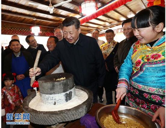 這是2月12日上午,習(xí)近平在阿壩藏族羌族自治州汶川縣映秀鎮(zhèn)考察時(shí)同居民群眾一起磨豆花。 新華社記者 鞠鵬 攝