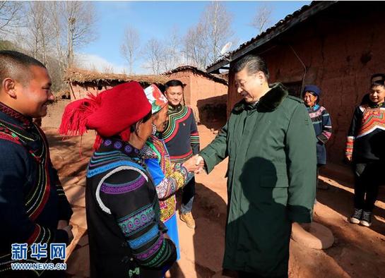 2月11日上午,習(xí)近平總書(shū)記驅(qū)車(chē)2個(gè)多小時(shí),從西昌市來(lái)到位于大涼山深處的昭覺(jué)縣三岔河鄉(xiāng)三河村、解放鄉(xiāng)火普村,走進(jìn)彝族貧困群眾家中,看實(shí)情、問(wèn)冷暖、聽(tīng)心聲,同當(dāng)?shù)馗刹咳罕姽采叹珳?zhǔn)脫貧之策。新華社記者 鞠鵬 攝