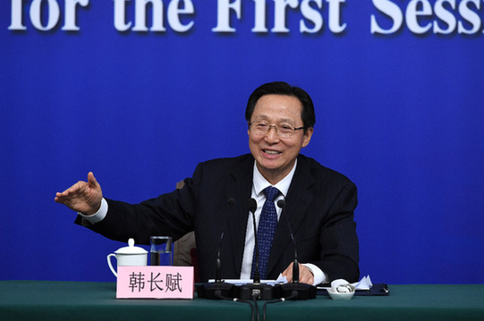 3月7日,十三屆全國人大一次會議新聞中心舉行記者會。農(nóng)業(yè)部部長韓長賦等就“實施鄉(xiāng)村振興戰(zhàn)略 推動農(nóng)業(yè)轉(zhuǎn)型升級”答記者問。新華社記者 申宏 攝