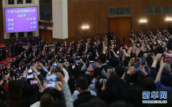 計票結(jié)果顯示,在國家主席、中央軍委主席選舉中,習(xí)近平均獲得全部2970張贊成票,全場報以熱烈掌聲。
