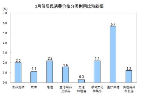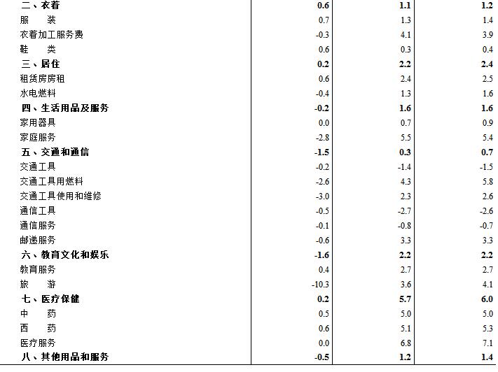 其他七大類價(jià)格同比均上漲。其中,醫(yī)療保健、居住、教育文化和娛樂(lè)價(jià)格分別上漲5.7%、2.2%和2.2%,生活用品及服務(wù)、其他用品和服務(wù)價(jià)格分別上漲1.6%和1.2%,衣著、交通和通信價(jià)格分別上漲1.1%和0.3%。