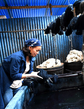 (左圖)4月12日,楊成蘭用傳統(tǒng)植物染料染紗。(上圖)4月12日,吳方?。ㄗ螅?、楊成蘭夫婦在查看剛?cè)镜亩弊逋敛肌?/p>
