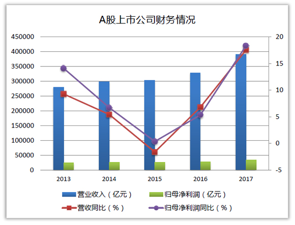 4月末,A股上市公司2017年年報披露結(jié)束。Wind統(tǒng)計(jì)數(shù)據(jù)顯示,2017年,A股上市公司的營收、凈利潤同比都有較大幅度上升。截至2017年12月,A股上市公司共3467家,實(shí)現(xiàn)營業(yè)收入38.96萬億元,同比增加17.2%,歸母凈利潤3.35萬億元,同比增18.3%,歸母凈利潤增速高于營業(yè)收入增速。滬深兩市公司在經(jīng)濟(jì)發(fā)展的韌性、結(jié)構(gòu)優(yōu)化、新動能等方面呈現(xiàn)出多個新亮點(diǎn),高質(zhì)量發(fā)展的趨勢正在形成。