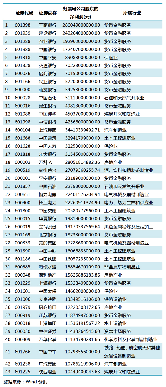在公布年報的上市公司中,43家實(shí)現(xiàn)歸屬于上市公司股東凈利潤超過100億元,躋身“百億俱樂部”。其中13家歸屬于上市公司股東凈利潤超過400億元,這些公司每天都能實(shí)現(xiàn)“賺它1個億”的“小目標(biāo)”。
