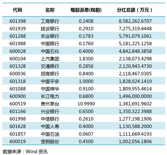 從分紅的總金額來看,計(jì)劃分紅超百億的公司共有17家,均出自上交所,且均為“百億俱樂部”的成員,其中,工商銀行以 858.23億元排在第一位;而從每股派息金額來看,貴州茅臺以10.9990元高居第一位,不過當(dāng)前茅臺的股價也是遠(yuǎn)遠(yuǎn)高于其它個股。