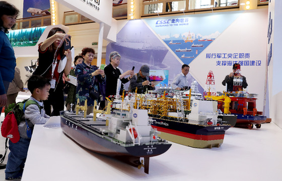 5月10日,參觀者在中國船舶工業(yè)集團(tuán)展位前觀看我國設(shè)計建造的船舶模型。記者 方喆 攝