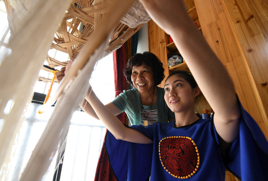 右圖為譚湘光(左)在工作室指導(dǎo)學(xué)生使用傳統(tǒng)織錦機。