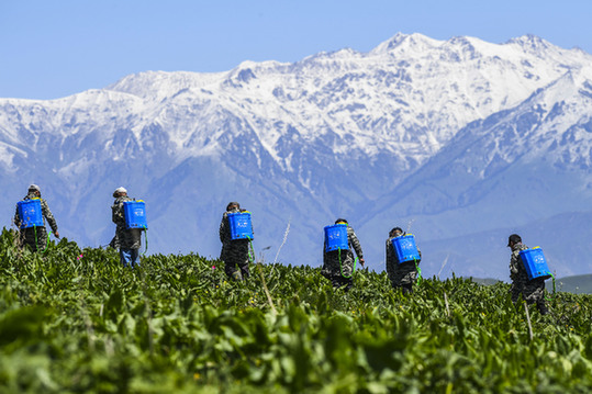 圖為村民在那拉提草原深處噴灑除毒害草藥劑。