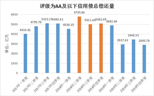 據(jù)WIND資訊統(tǒng)計,評級等級較低的AA及以下信用債總償還量在今年二季度達5795.80億元,接下來的三季度和四季度并未有明顯減少,分別為5011.46億元和5082.49億元。而在信用風險的影響下,今年以來,取消、推遲發(fā)行的各類債券有300余支,涉及金額約2000億元。