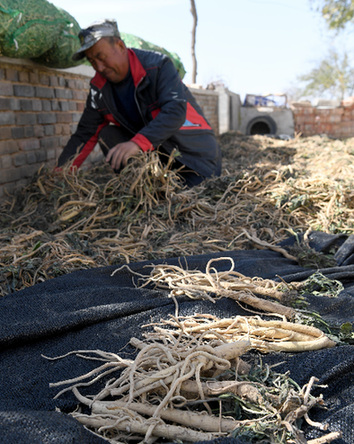 黃家窯村附近的山坡上,村集體的大型拖拉機(jī)正在給村民張明寬收獲中藥材板藍(lán)根。風(fēng)吹得人都有點(diǎn)站不住,老張跟在拖拉機(jī)后面,躬著腰拔板藍(lán)根?!翱h里有公司按合同收購(gòu),一斤三塊五,收到家里,錢(qián)就算是到手了。”老張忙得頭也不抬。