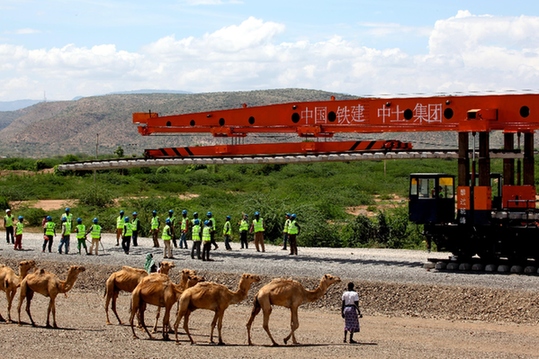 圖為2014年4月27日中國鐵建中土集團的工人在埃塞俄比亞德雷達瓦進行亞吉鐵路先期鋪軌作業(yè)的資料照片。新華社發(fā)(劉渝 攝)