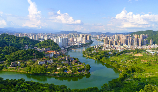 瀏陽河畔、羅霄山中崛起的瀏陽主城區(qū)。(鄧霞霖 攝)