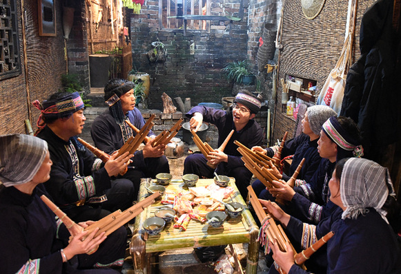 圖為徐維生(中)和幾個(gè)村民一起探討蘆笙吹奏技藝。