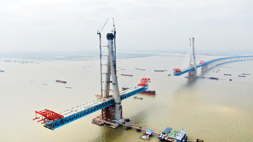 5月8日,由中鐵大橋局承建的滬通長江大橋南主塔29號墩高度突破300米,達305.5米,預(yù)計7月封頂。新華社發(fā)(許叢軍 攝)