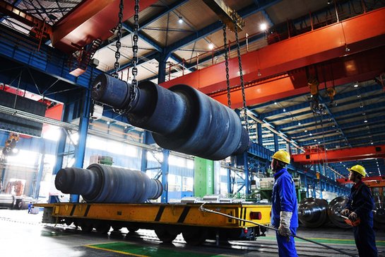 在中國(guó)一重集團(tuán)的生產(chǎn)車間,起重機(jī)吊起產(chǎn)品。記者 王建威 攝