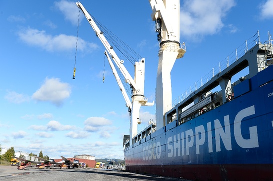 圖為中遠(yuǎn)海運(yùn)“天恩”輪在瑞典東北部港口城市海訥桑德的碼頭上進(jìn)行卸貨作業(yè)。記者 劉紅霞 攝