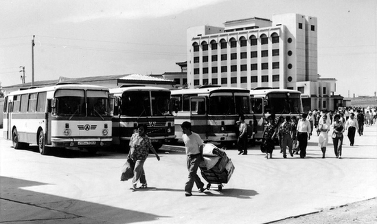在滿洲里中俄互市貿(mào)易區(qū),人們從俄羅斯巴士前走過。(2002年資料照片)
