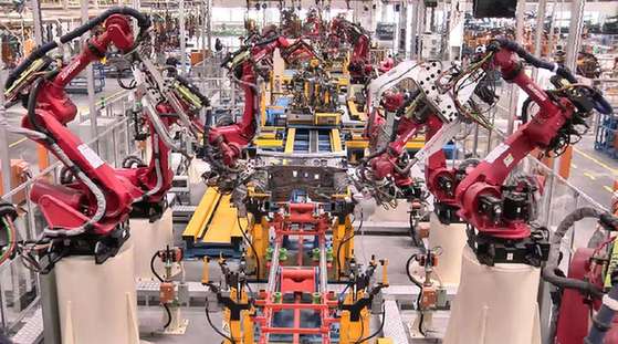 按照寶馬工業(yè)標準設計的華晨中華M8X智能化裝焊車間。資料圖片