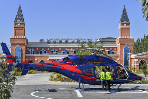在新疆霍爾果斯旅游集散中心,工作人員為乘坐直升機(jī)游玩的旅客做起飛準(zhǔn)備。記者 胡虎虎 攝