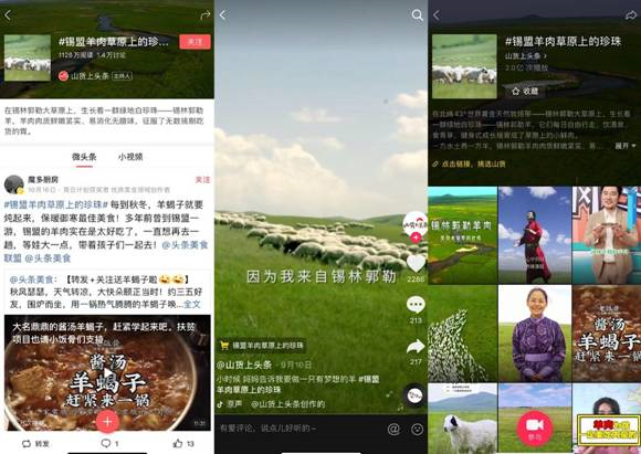 “山貨上頭條”是基于今日頭條等產(chǎn)品發(fā)起的扶貧項(xiàng)目,為了讓內(nèi)蒙古特色更好地走出去,項(xiàng)目組為當(dāng)?shù)卮_定了“錫林郭勒羊,來自大草原的珍珠”的品牌傳播定位,邀請專業(yè)內(nèi)容制作團(tuán)隊(duì)、平臺優(yōu)質(zhì)內(nèi)容創(chuàng)作者以圖文、短視頻等方式,展示羊肉產(chǎn)品特點(diǎn)、草原生態(tài)環(huán)境等,并帶動(dòng)平臺用戶共同傳播推廣,從而提升錫林郭勒羊肉產(chǎn)品品牌認(rèn)知度。