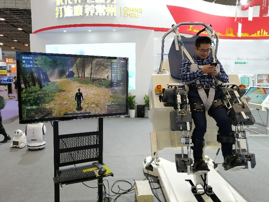 江蘇常州一家公司的康復(fù)訓(xùn)練產(chǎn)品,亮相2019江蘇國(guó)際養(yǎng)老服務(wù)業(yè)博覽會(huì)。(新華社發(fā))