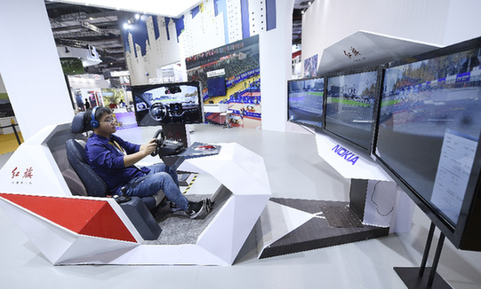 11月5日,工作人員在演示紅旗汽車與諾基亞公司聯(lián)合開發(fā)的5G遠(yuǎn)程駕駛技術(shù)。當(dāng)日,第二屆中國國際進(jìn)口博覽會(huì)在國家會(huì)展中心(上海)開幕。記者 王鵬 攝