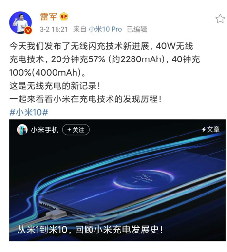 此次小米發(fā)布的自研40W無線+MI-FC閃充技術受到行業(yè)高度好評,高速充電不發(fā)熱,4000mAh電池,20分鐘充57%(約2280mAh),40分鐘充滿100%(4000mAh),這是無線充電新記錄,小米無線充電技術依然全球最快、最領先。