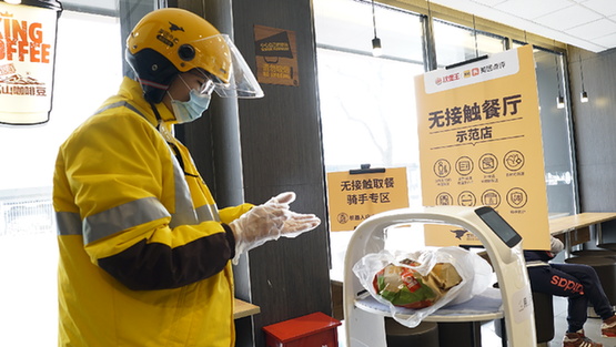 美團(tuán)外賣騎手到無接觸餐廳示范店取餐。資料照片