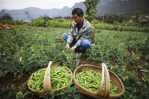 畢節(jié)市黔西縣大關鎮(zhèn)村民在扶貧基地內(nèi)采摘豌豆。新華社發(fā)(周訓超 攝)