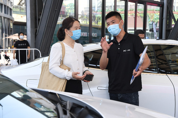 6月6日,在北京華熙LIVE·五棵松商業(yè)街區(qū)舉辦的“北京消費(fèi)季之悅動(dòng)海淀”活動(dòng)現(xiàn)場(chǎng),工作人員(右)向市民介紹一款汽車的配置。當(dāng)日,北京消費(fèi)季正式開啟,進(jìn)一步推動(dòng)北京各行業(yè)復(fù)商復(fù)市,加快實(shí)現(xiàn)消費(fèi)回暖。