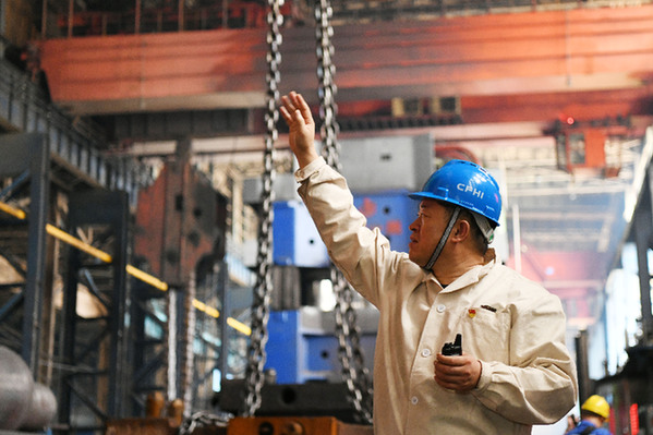 在中國(guó)一重生產(chǎn)車間,工人在進(jìn)行生產(chǎn)作業(yè)。記者王建威 攝