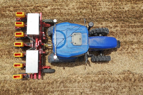 在河南省鄧州市小楊營(yíng)鎮(zhèn)安眾村,加裝有北斗導(dǎo)航系統(tǒng)的拖拉機(jī)在無人駕駛狀態(tài)下播種。