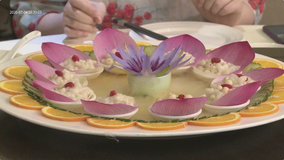 此時正值古猗園舉辦荷花展,餐廳推出了飽含荷花元素的“荷花宴”?!皸蠲窌r節(jié)”“雙魚戲荷”“秋葵大黃魚”“金湯芙蓉球”“蓮花魚米盞”等幾道菜肴被端至嘉賓面前。先于味覺感受的是視覺美,幾道菜肴引得直播間的網(wǎng)友大流口水。在品嘗菜肴的間隙,節(jié)目還“混搭”了一款雪糕——頗具人氣的“鐘薛高”。鐘薛高是來自南翔的企業(yè)之一,其瓦片狀的外形極具中式美,精選原料制成的雪糕讓這家創(chuàng)立于2018年的企業(yè)快速成長為“新國潮”。