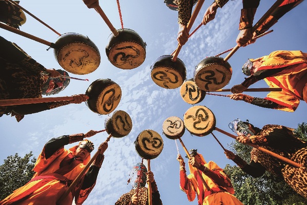 巴象鼓舞是閬中土著巴人由巫舞演化而來的狩獵舞和戰(zhàn)舞,在當(dāng)?shù)孛耖g代代傳承,至今頑強地保留著巴人的基因——彪悍粗獷、能歌善舞、勇猛尚武……正如古籍所載,“閬中有渝水,賨人居左右,銳氣善舞”“周武王伐紂,實得巴蜀之師……巴師勇銳,歌舞以凌殷人,前徒倒戈。故世稱之曰‘武王伐紂,前歌后舞’也。”
