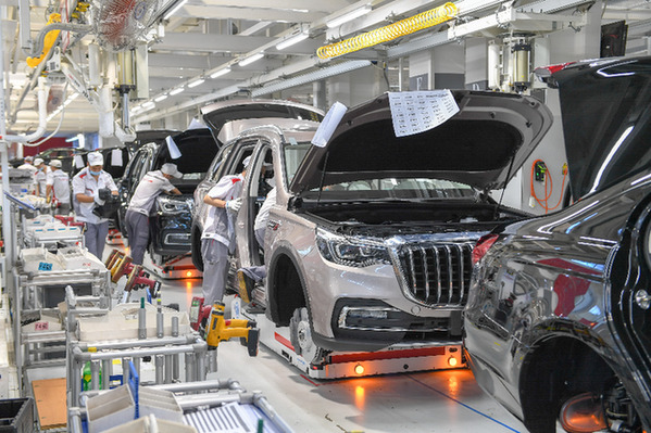 在位于長(zhǎng)春的一汽紅旗總裝車(chē)間,工人裝配車(chē)輛。